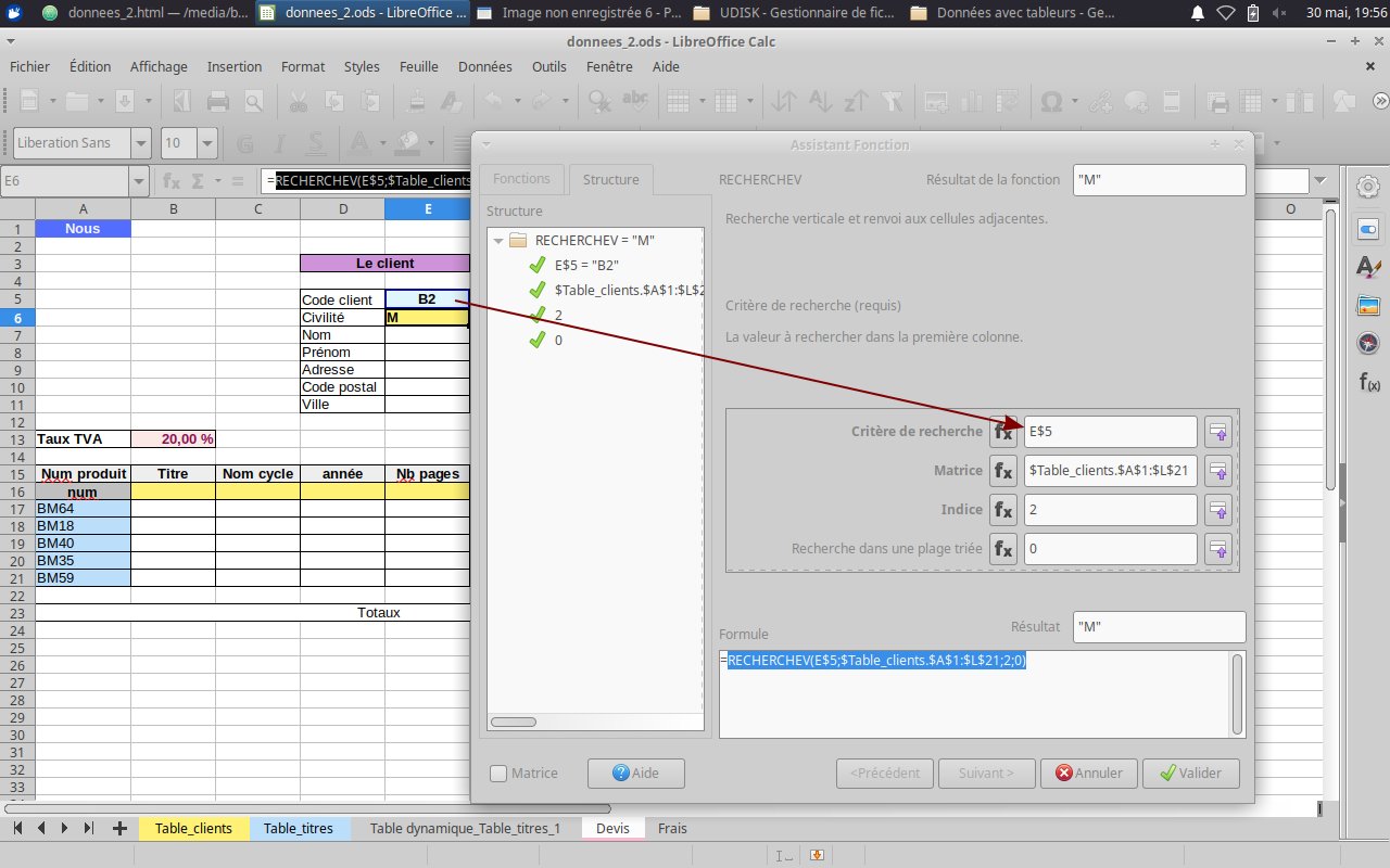 La cellule E5 contient le code (B2) d'un client (Claudio Durant). Ce code, associé à la feuille des clients va permettre de faire afficher les informations de ce client dans les cellules E6 à E11 de la feuille Devis. La fonction RECHERCHEV le permet et se trouve dans le menu ou bandeau Données. On place le curseur en E6::
