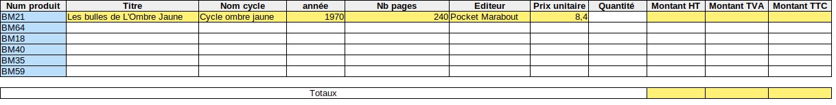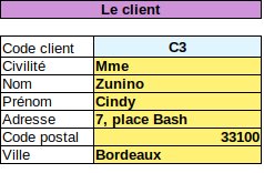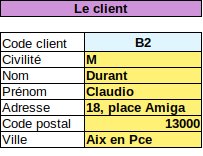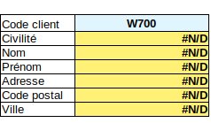 Tout changement de code client en E5 permet de modifier les information des cellules E6 à E11 Tout code n'existant pas entraîn e message d'erreur ci-dessus.
